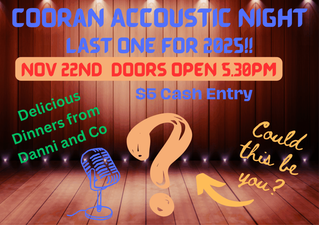 Hope to see you all at the next Cooran Acoustic Night – our local, family friendly blackboard night in the Cooran Hall. NEW START TIME Doors open at 5.30pm to put your name on the board, and performances start at 6pm. From beginners to seasoned performers, a supportive local crowd would love to hear what you have been practicing in the living room! $5 entry, all proceeds go back to the maintenance of our beautiful Hall.
