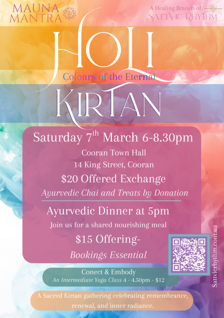 Begin with an optional Radiant Yoga Flow (4:00–4:50pm, $12), enjoy a nourishing Ayurvedic meal (5:00–6:00pm, $15), then immerse in Kirtan & Mantra (6:00–8:30pm, $20).